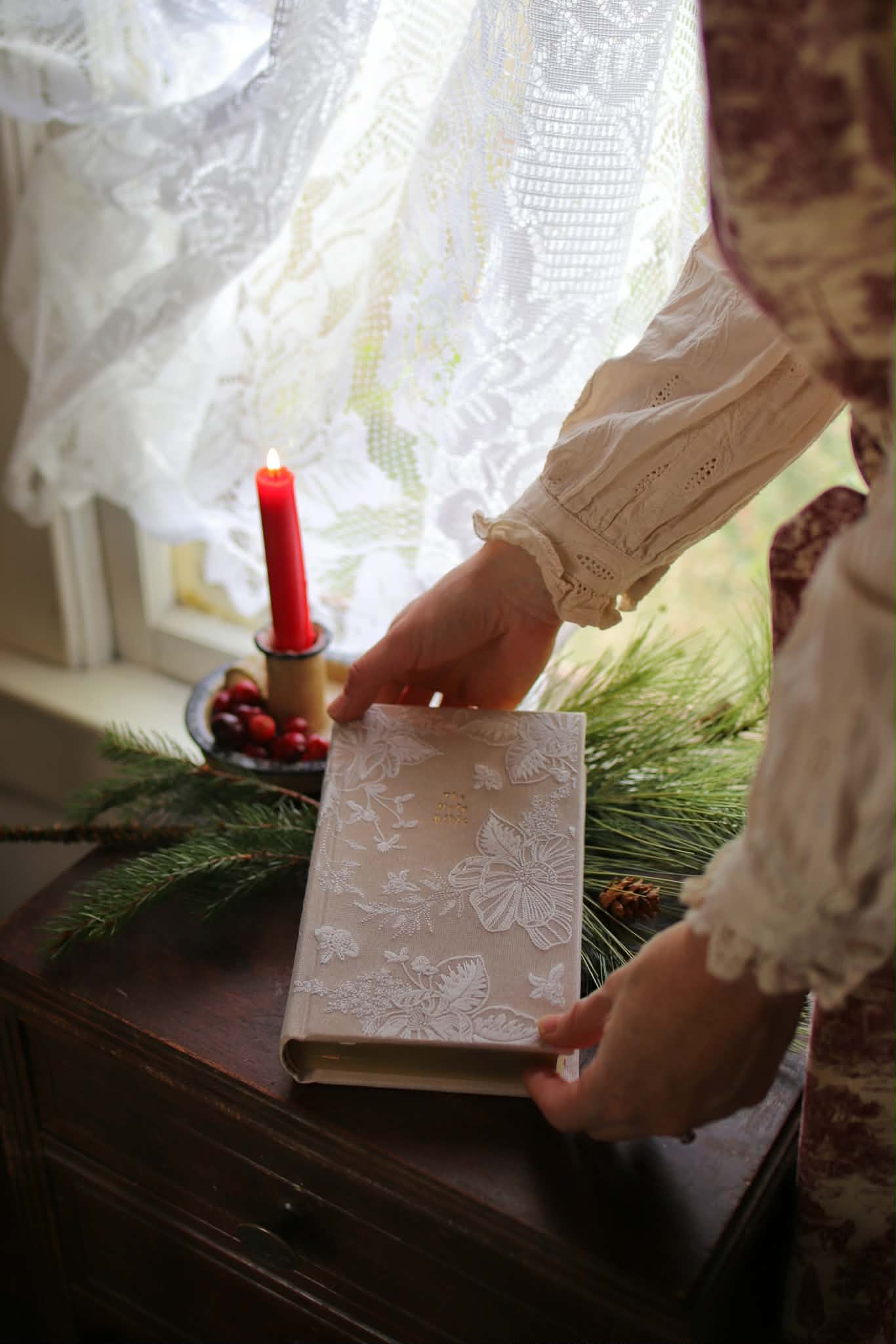 A curated collection of antique art prints, Bibles, and keepsake journals.